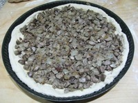 Теперь выкладываем начинку. Чуть не забыла, вилкой сделайте проколы на основании пирога. Обжаренный лук с печенью на растительном масле. |