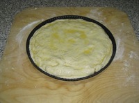 Тесто готово и мы начинаем собирать наш простой закусочный пирог. У меня тефлоновая форма, я ее даже не смазываю. Раскатываю тесто и делаю бортики. Если нет формы, используйте противень. |
