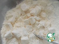 Холодное сливочное масло порубить ножом в крошку постепенно добавляю муку. |