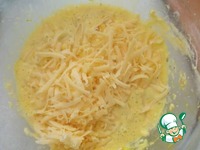 Добавить яйца и немного взбить, добавить половину сыра, предварительно потертого на средней терке. |
