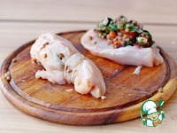 Начинить начинкой подготовленные "кармашки" куриного филе, обвязать кулинарной нитью или скрепить зубочистками. |