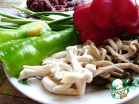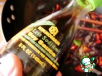Добавить перцы и прогреть до появления аромата. Влить соевый соус «Киккоман» и тушить 2-3 минуты, помешивая. |
