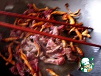 Раскалить масло в воке и обжарить грибы до румяности. Добавить говядину и, помешивая, обжарить до побеления мяса. |