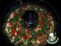 Теперь выкладываем половину перца и присыпаем половиной зелёного лука. После этого выкладываем ещё 1/3 теста и повторяем слои. Всё это закрываем оставшимся тестом. |