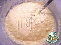 Добавить тертый сыр и муку с разрыхлителем. Перемешать. Тесто получится густое и вязкое. |