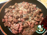Теперь начинка: Печёнку нарезать произвольными кусками и обжарить на подсолнечном масле. Обжаренную печёнку ещё пару раз разрезать на более мелкие кусочки. |