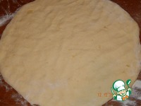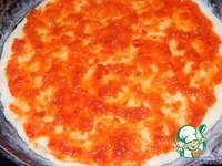 Форму смазываем маслом, присыпаем мукой. Выкладываем в нее тесто, смазываем кетчупом или соусом. У меня, к сожалению, даже майонеза не оказалось, смазала аджикой. |