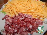 Подготавливаем нашу начинку. У меня осталась колбаса и сыр с нарезки, нарезанный сыр трудно тереть на терке, так что я все просто нарезала ножом. |