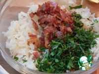 Перемешиваем рис, грудинку и измельченную зелень. |