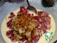 В фарш добавляем закрепитель, а также половину жаренного лука. Немного солим и перчим. Все хорошо перемешиваем. |