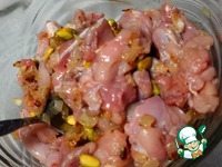 Достаем с холодильника маринованного кролика. Добавляем к нему оставшийся лук и фисташки (предварительно очищенные от верхней кожицы). |