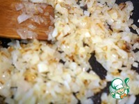 Чеснок мелко рубим. Добавляем его к луку и обжариваем вместе около минуты. Выкладываем лук из сковороды. |
