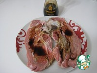 Отбивные сбрызнуть соевым соусом, оставить на 10 минут. У меня соус Kikkoman. |