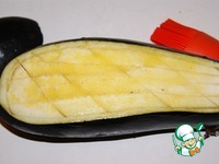 Мякоть подрезать по кругу и, сделав надрезы по всему баклажану, но не протыкая кожуру, смазать оливковым маслом (2 ст. л.) Запечь в СВЧ (микроволновке) или в духовке, почти до готовности. |