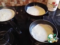 Шаг 4: Разогреваем сковороду, в моём случае их было три, смазиваем маслом и заливаем тесто. Извините за беспорядок, я очень спешила, мой маленький сынуля не давал покоя. |