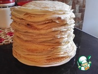 Жарим блины только с одной стороны. Вот столько блинов у меня вышло из двойной порции. 110 штук. Из данной в рецепте где-то 50-60 штук, зависит от сковородки. |