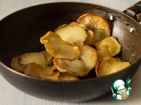 Картофель почистить и нарезать тонкими ломтиками. Обжарить на растительном масле, выложить на бумажное полотенце, чтобы удалить лишний жир. |