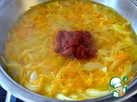 В глубокой тяжелой сковороде разогреть оливковое масло и пассеровать овощи до размягчеиния лука. |