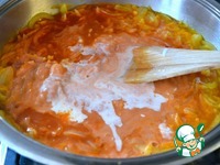 Положить соус пассата (протертые помидоры) и добавить сметану, смешанную с мукой. |