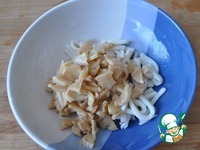 Добавляем к кальмару нарезанные маринованные шампиньоны, мне попалась банка с ножками. |