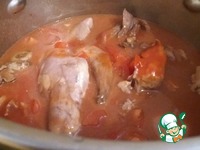 Томатный сок и свежий помидор. Доливаем воду или овощной бульон так, чтобы все ингредиенты покрывались жидкостью. |
