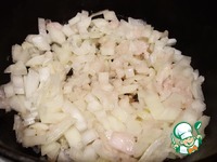 В чугунной кастрюле растопить нарезанный бараний жир. Добавить нарезанный репчатый лук. Перемешать. |