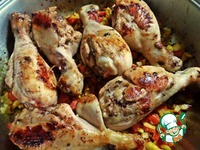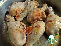 Наливаем около стакана воды, накрываем крышкой и тушим на маленьком огне до готовности курицы. Иногда переворачиваем курицу и поливаем соусом. |