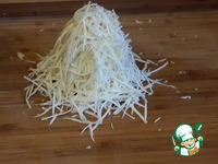 Натрите на терке копченый колбасный сыр (именно он придаст аромат дымка салату) |