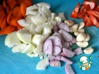 Подготовить все овощи. Морковь, репчатый лук, лук-шалот, помидор вымыть и нарезать не очень мелко. Очистить чеснок и подготовить ароматические травки. |