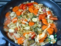 Выложить нарезанные овощи вместе с зеленью и черным перцем в сковороду, где обжаривалось мясо. Обжарить овощную смесь пару минут. |