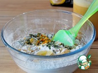 В миску просеять муку и разрыхлитель, добавить нарезанный засахаренный имбирь. |