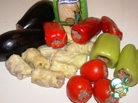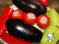 Затем перец и баклажаны и на самый верх - помидоры. В оригинале в состав входил и отварной до полу-готовности нут, можно его заменить фасолью, я обошлась без этой добавки. |