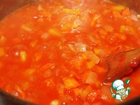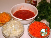 Соус: Нарезать перец и морковь кубиками. Точно так же нарезать лук, снять с чеснока верхнюю шелуху. Помидоры натереть на терке (без кожицы). |