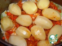 Влить по бокам воду, так, чтобы она лишь слегка прикрывала низ перца. Овощи при варке выделят свой сок, так что жидкости будет достаточно! |