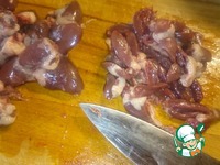 Сердечки промыть. Разрезать на четвертинки. Сложить в кастрюлю, залить холодной водой 2,5 литра и варить 20 минут. |
