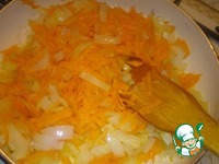 Лук порезать кубиками, морковь натереть на крупной терке. Обжарить на подсолнечном масле 5-7 минут. Добавить в наш суп. |