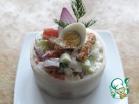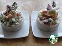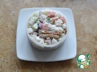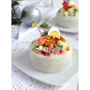 Описание: Вкусный праздничный салат-закуска из свежих овощей с копченой семгой и ржаными сухариками! Благодаря порционному оформлению в "белой шубке", салат смотрится как нельзя кстати на новогоднем зимнем столе!