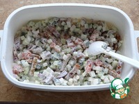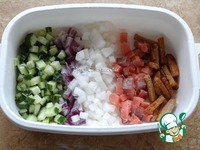 Порезать кубиками огурец, дайкон, лук, семгу, добавить сухарики; |