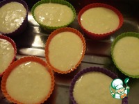 И заливаем ранее приготовленное тесто, до 2/3 высоты формы. Если делать кексы с начинкой, то нужно залить тесто, покрыв донышко, положить джем и затем залить до 2/3. |