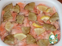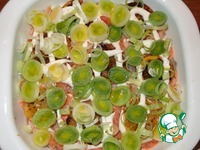 Или, 2 вариант, поливаем рыбу с лимонами майонезом или сметаной и сверху выкладываем, порезанный кружками лук-порей. |