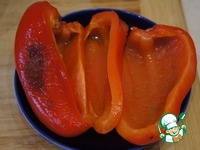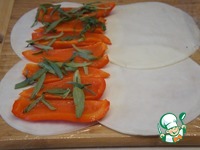 Затем снять кожицу с перчиков и нарезать их длинными пластинками. На сырные блинчики разложить полоски перца, посыпать зеленью (у меня был эстрагон). |