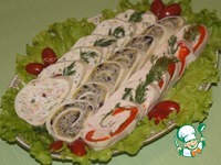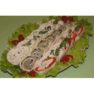 Затем плоское блюдо застелить листьями салата. Рулеты освободить от пленки и нарезать ломтиками, выложить рядами на блюдо. Украсить и подать к столу. |