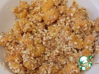 Курагу вымыть, порезать небольшими кусочками и залить на 15 - 20 мин. коньяком. Орехи измельчить в некрупную крошку. Курагу вынуть из коньяка и смешать с орехами. |
