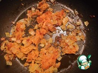 Лук режем мелким кубиком. Морковь трем на средней терке. Пассеруем на растительном масле до золотистого цвета. |