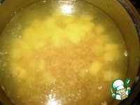 В кипящий бульон добавить картофель, перловую крупу и лавровые листики, довести до кипения, убавить огонь и варить минут 20-25. |
