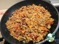 Затем снимаем крышку со сковороды, делаем в овощах посредине углубление и выкладываем туда гречку |