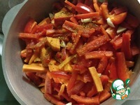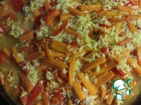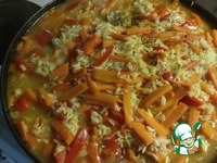 Пока мясо варится, в другой большой сковороде или казане поджарить натертую на крупной терке морковь, порезанный соломкой перец и порубленный чеснок, посолить, добавить специи. |