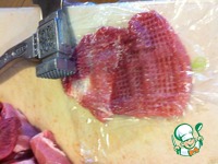 Хорошо отбиваем, солим и перчим. Перед тем как отбивать, можно накрыть кусок мяса пищевой пленкой, тогда мясной сок не будет разбрызгиваться в разные стороны. |