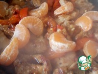 Затем добавляем перец и обаживаем его до мягкости, отправляем имбирь и дольки мандарина. Пару минут обжариваем вместе с мясом помешивая. |