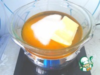 Теперь берём миску, кастрюльку, кладём в неё мёд + сахар + масло и ставим на водяную баню до растворения сахара. Можно поставить на очень маленький огонь.. |